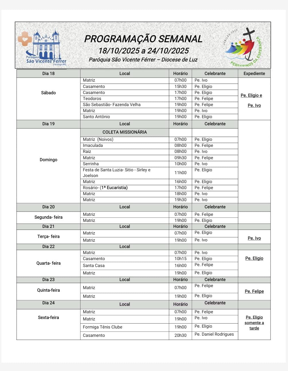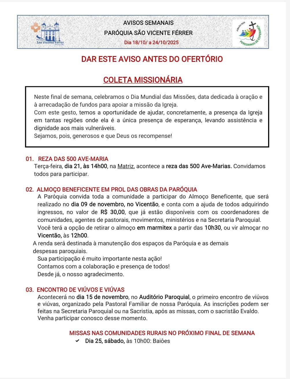 AVISOS E PROGRAMAÇÃO DA PARÓQUIA