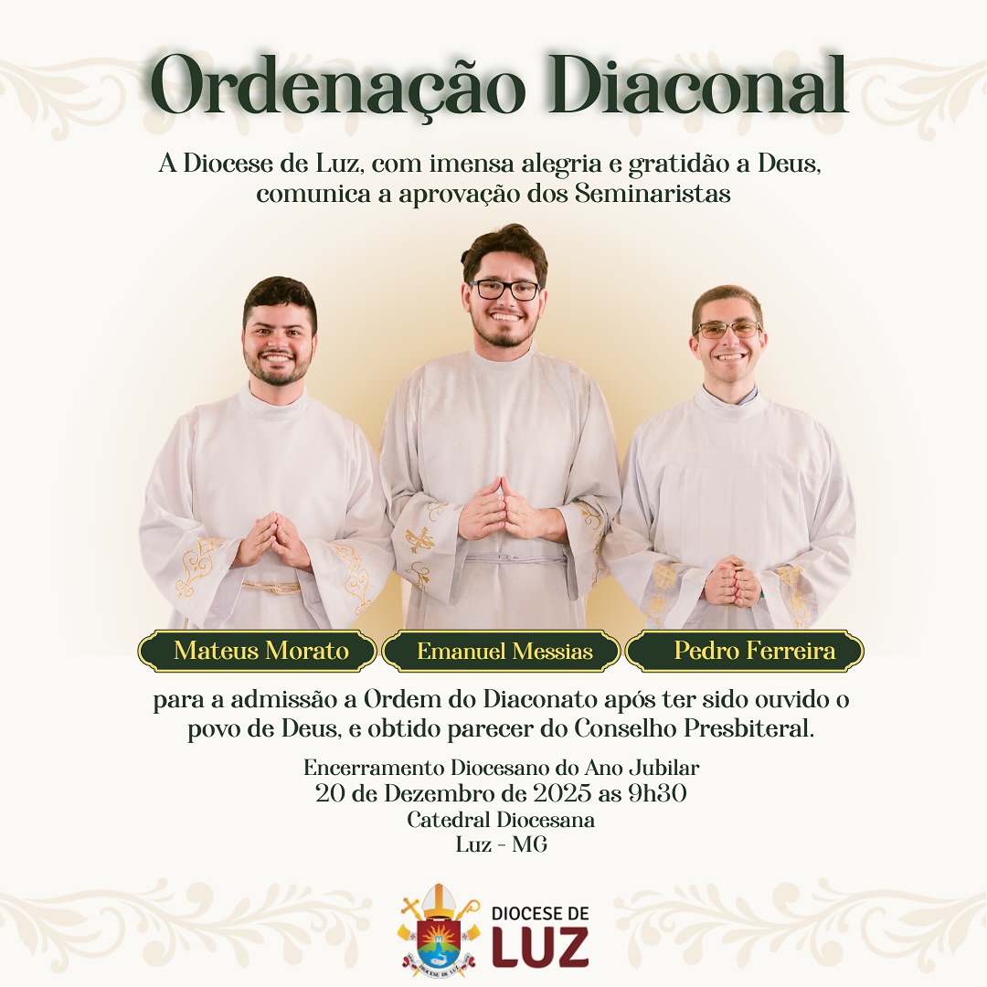 Tendo sido ouvido o Povo de Deus, e se obtido o parecer favorável do Conselho Presbiteral, os Seminaristas Emanuel, Mateus e Pedro Ferreira receberão a Ordenação Diaconal na celebração diocesana de encerramento do Ano Jubilar, essa acontecerá em 20 de Dezembro de 2025 às 9h30 na Catedral Diocesana de Luz.